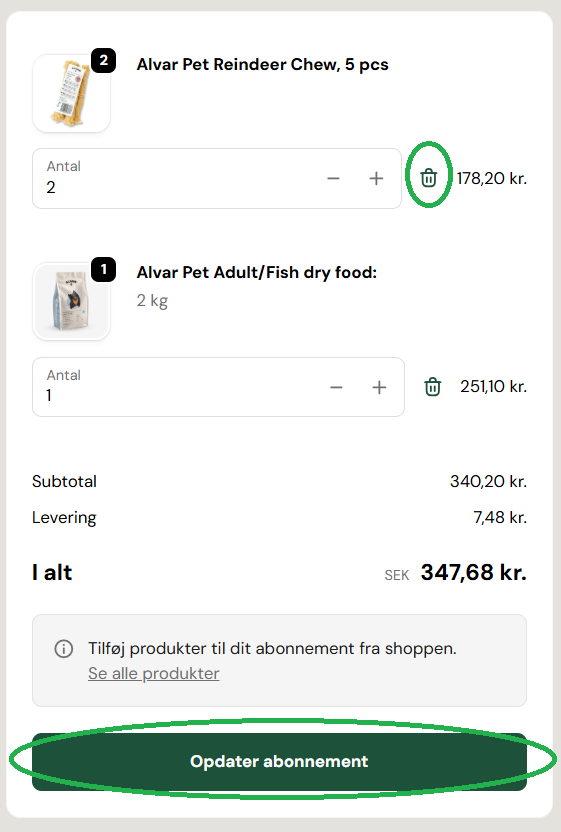 Du kan nemt fjerne produkter fra din tilbagevendende bestilling via kundesiden. Klik på skraldespandsikonet ved siden af produktrækken, så ændres produktets antal til 0. Klik derefter på den grønne knap “Opdater abonnement”, og produktet fjernes fra visningen.