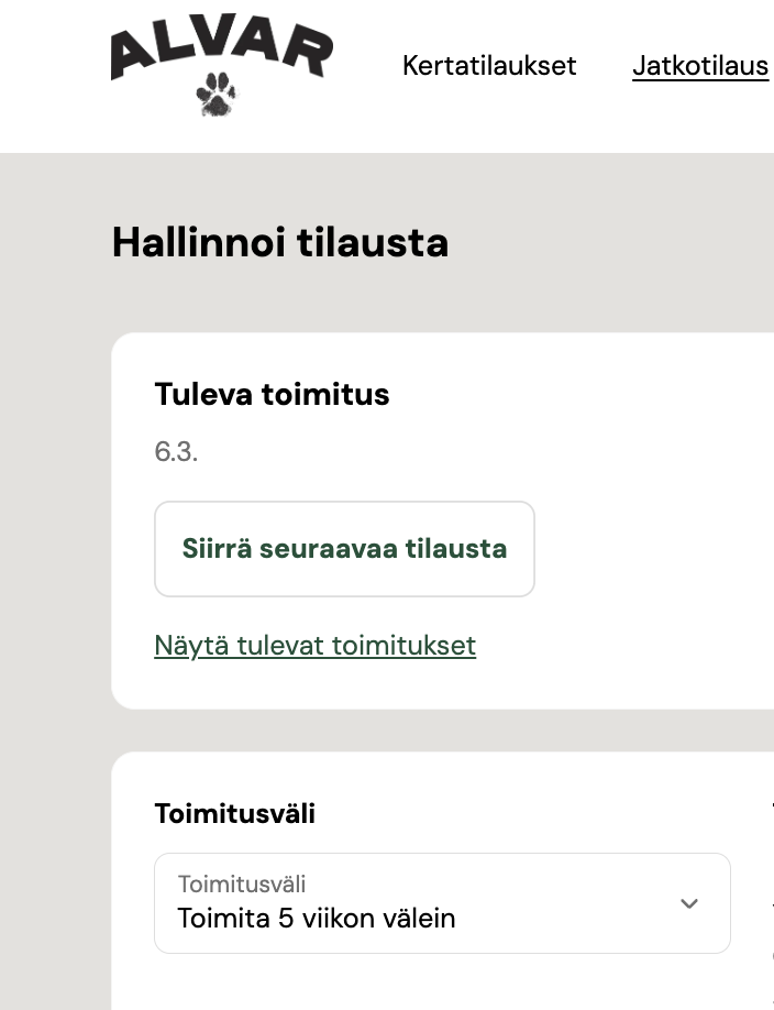 You can move an upcoming delivery forward by clicking the “Siirrä seuraavaa tilausta” button. This link opens a calendar view where you can select the next order date.