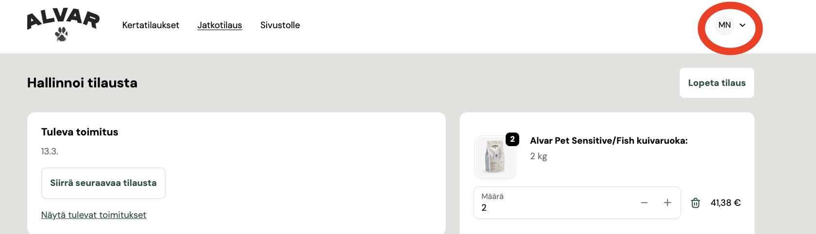 You can update your billing details through your profile on the customer pages. You can access your profile via the initials shown in the top-right corner. Your current billing details can be found under the “Maksutavat” section, where you can also add a new payment card to your subscription.