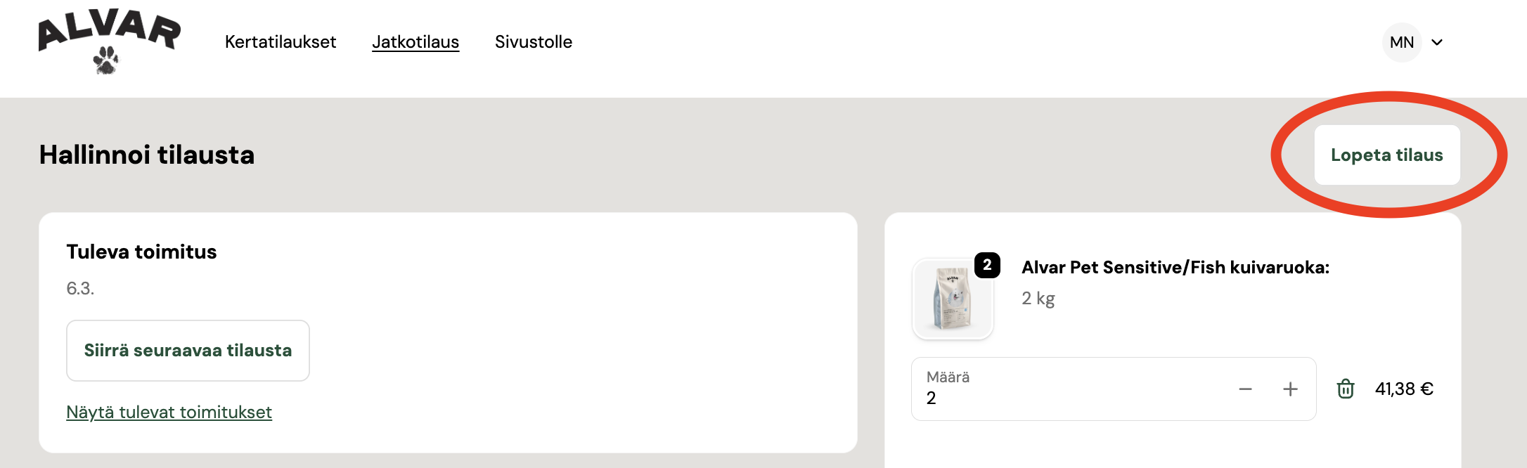 Jatkuvan tilauksen peruminen onnistuu omien asiakassivujen kautta. Klikkaa auki tilauksen hallintasivu, ja sivun yläreunasta löydät "Lopeta tilaus"-nappulan.