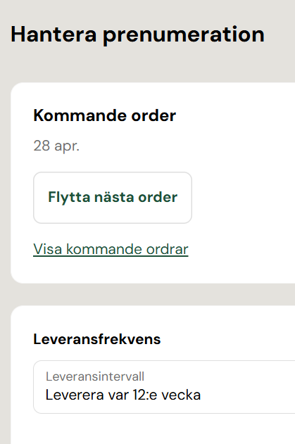 Du kan flytta den kommande leveransen via knappen ”Flytta nästa order”, som öppnar en kalendervy där du väljer nästa beställningsdatum.